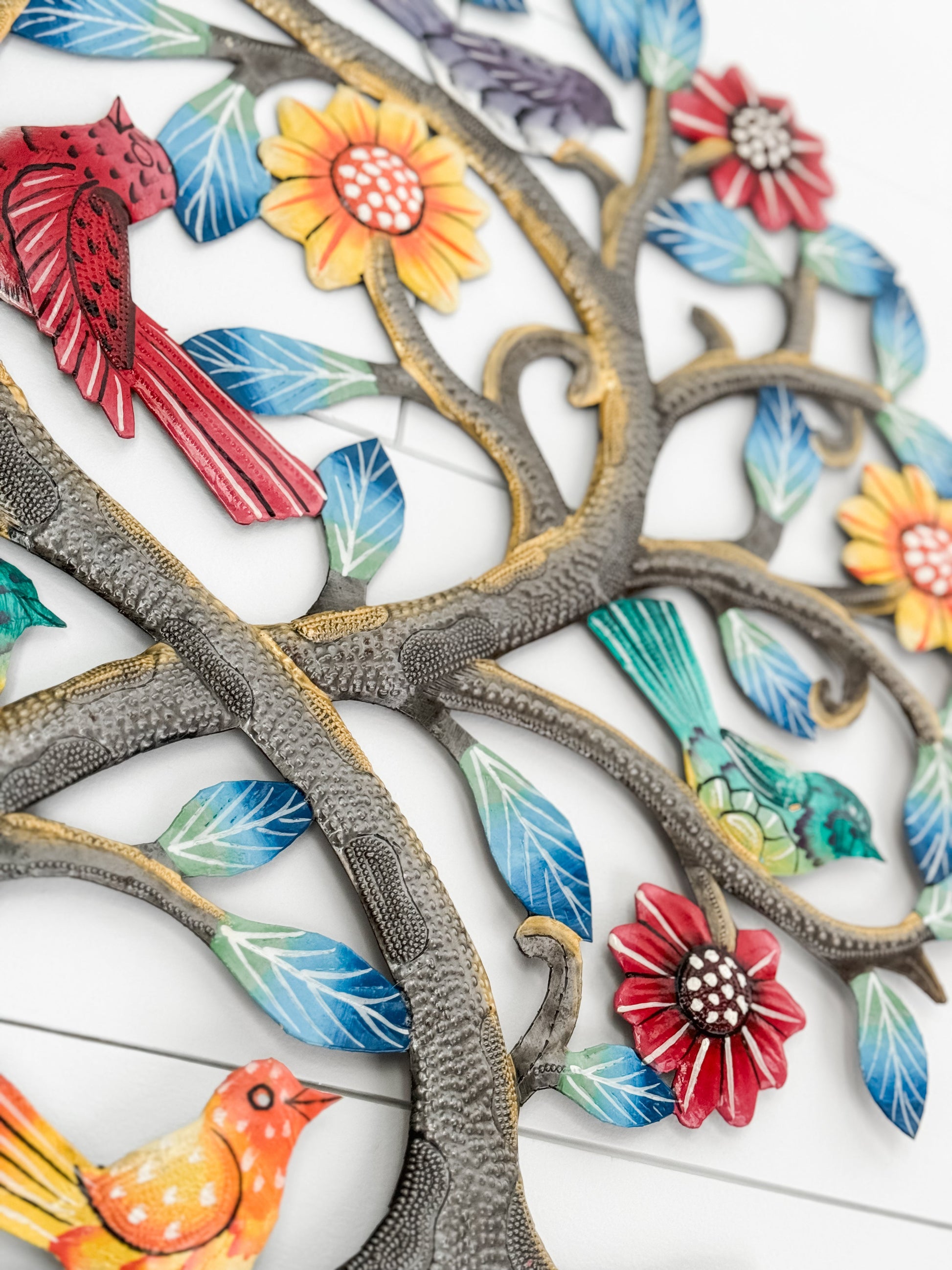 Expertly handcrafted by artisans at Anchored in Hope, the Intertwined Trees Oil Drum Art is a stunning piece of art made from recycled 55-gallon oil drums. Each piece is unique, showcasing the beauty and creativity of Haiti's skilled artisans.