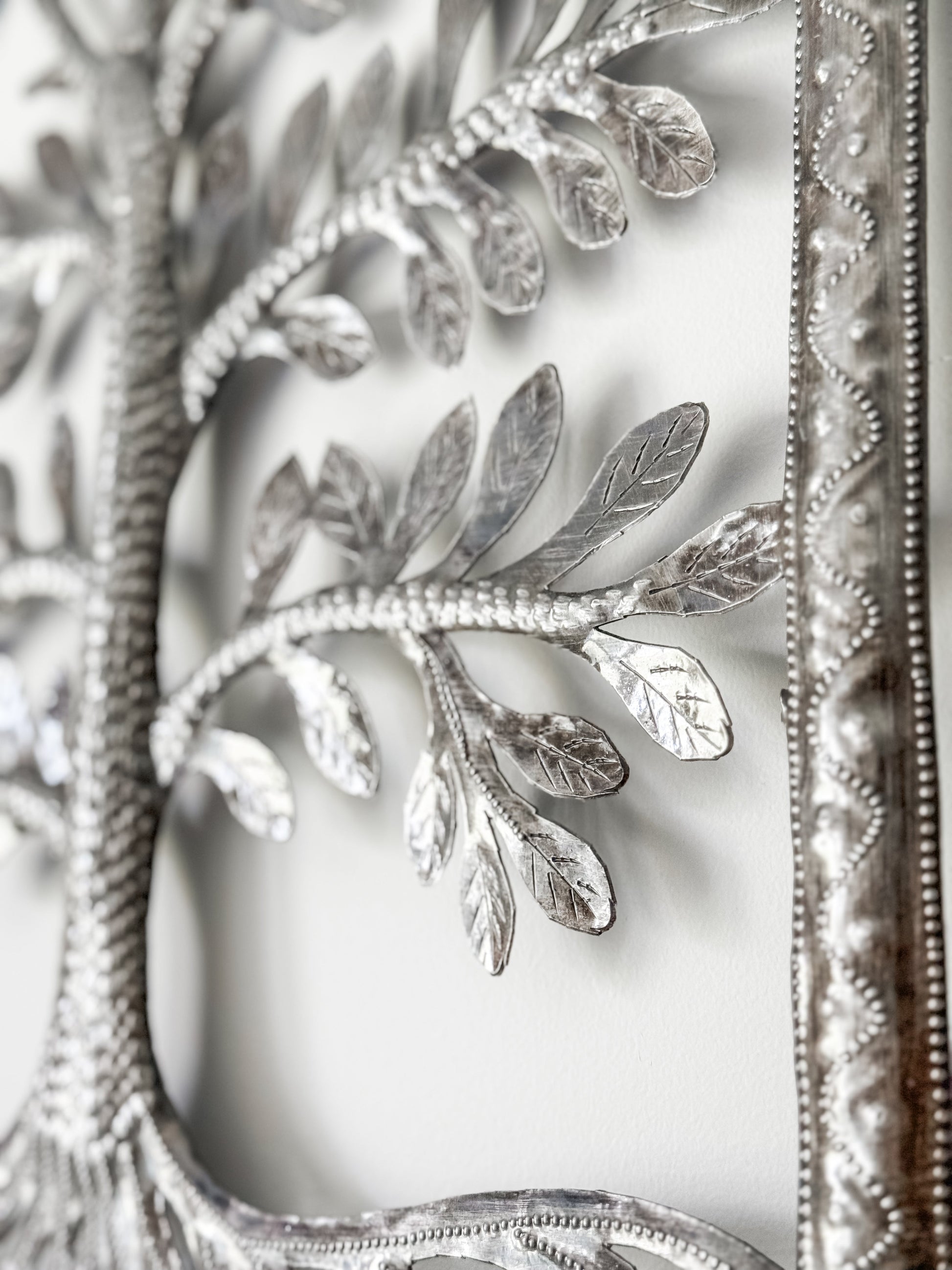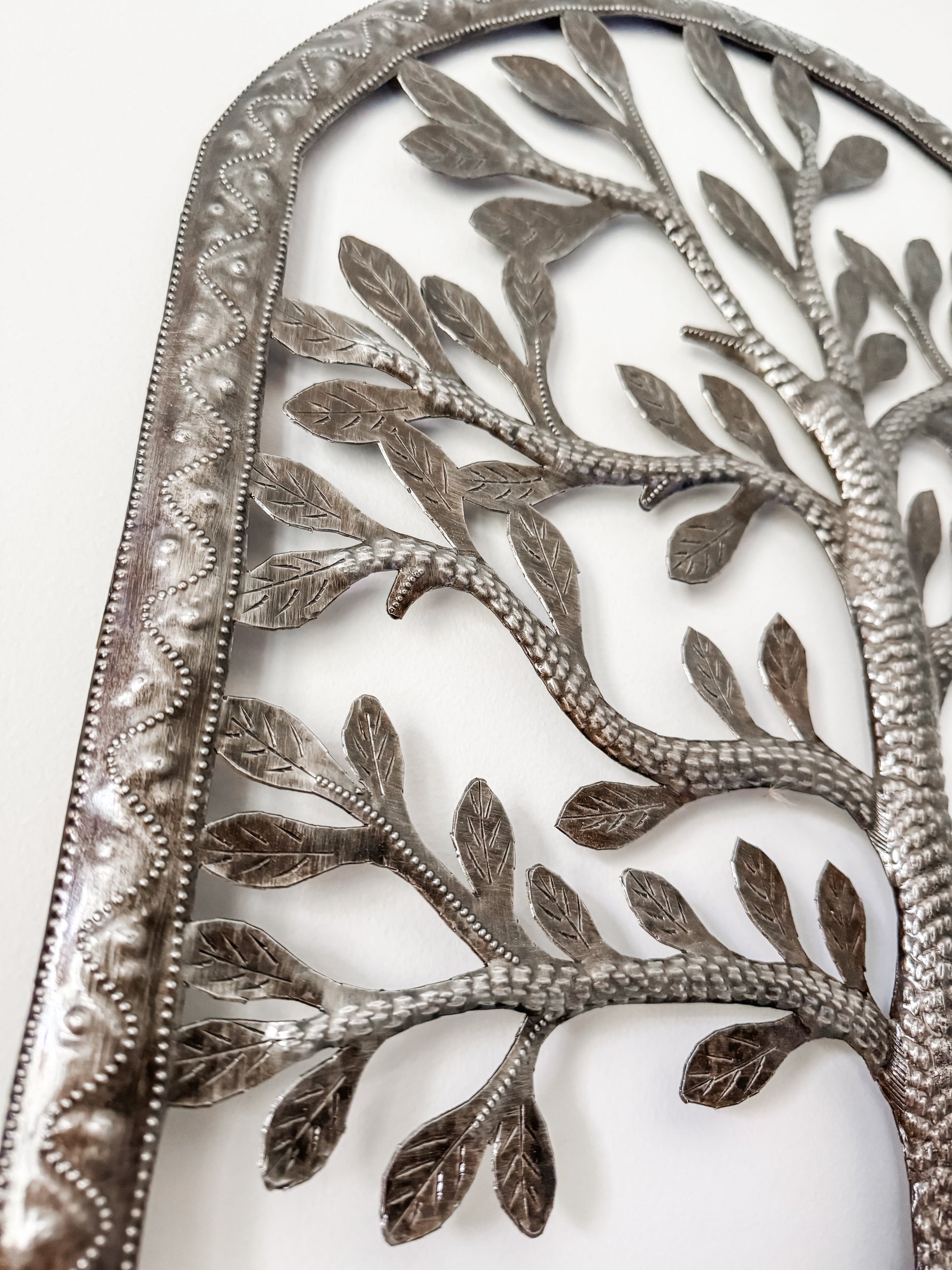 The Haitian Tree of Life Metal Art is a substantial art piece for your wall with plenty of 'wow' factor. Made from recycled 55-gallon oil drums in a small Haitian village, the talented metal artisans cut, hammer, and chisel the metal into gorgeous pieces with amazing detail. Your purchase helps these artisans stay busy, provide more jobs, and support their families.
