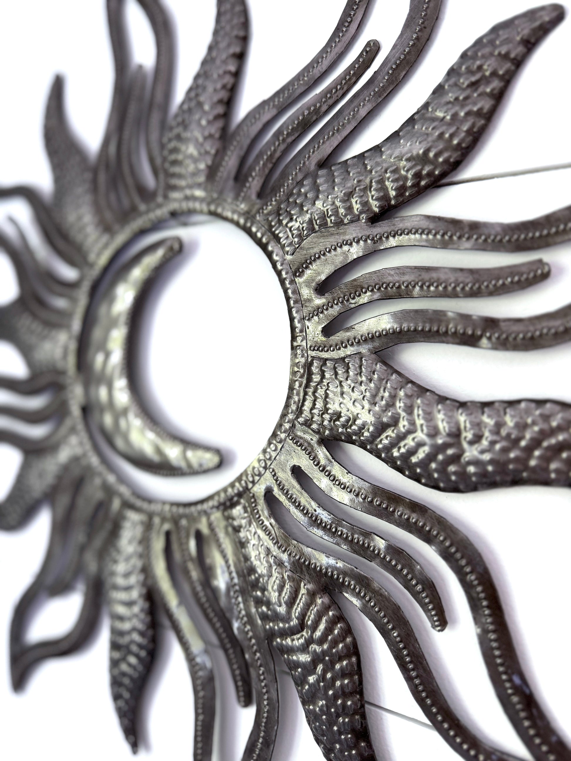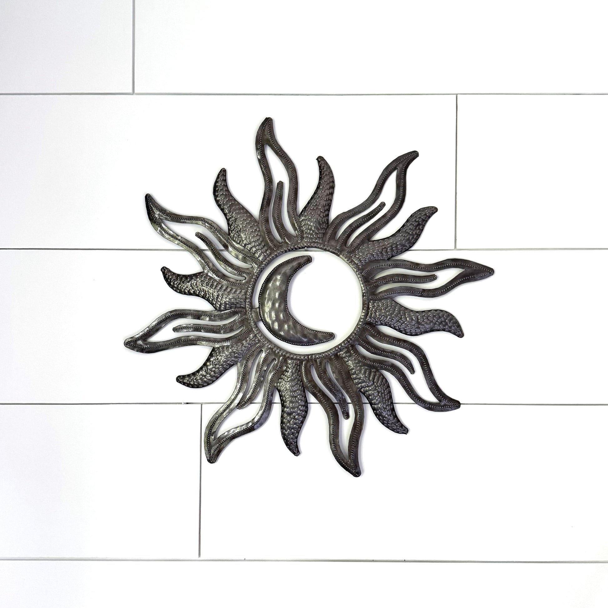 Crafted from recycled oil drums and brought to life with a hammer and chisel, this handcrafted sun and moon wall art is a striking symbol of harmony. Haitian artisans skillfully shape and etch each celestial detail by hand, transforming discarded metal into a radiant expression of light and dark, day and night. Perfect for indoor or outdoor display, this piece adds both artistry and meaning to your space.